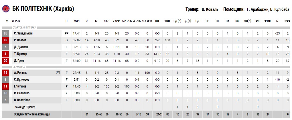 В концовке за пять фолов сел на скамейку Девис. Рочняк и Козлов заработали по 4 фола. Ключевым моментом матча стал смелый бросок Т.Дж. Кромера. За 30 секунд до окончания времени, при счете 74:74, американский легионер забил три очка и вывел команду вперед. Далее «Киев-Баскет» пытался исправить ситуацию в свою пользу, но «Политехник» выстоял и добыл свою вторую победу в сезоне 77:81.